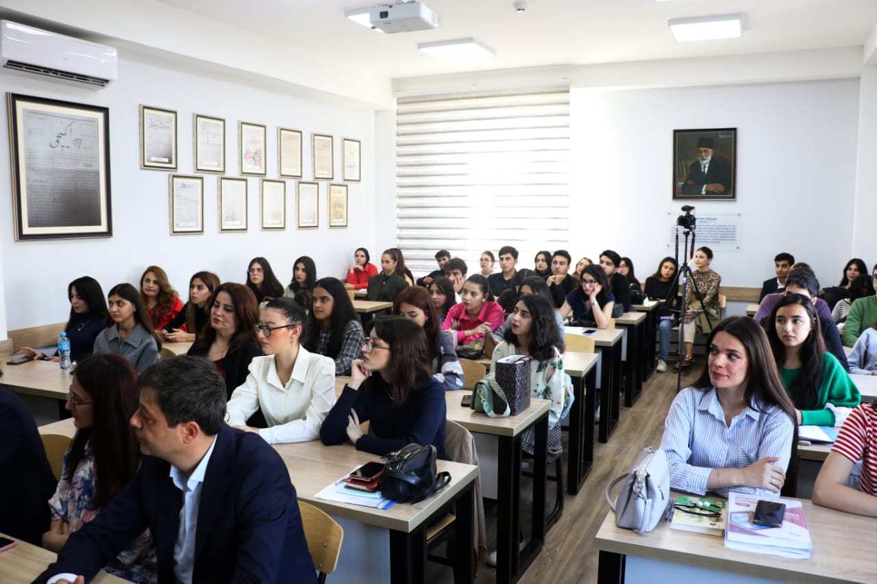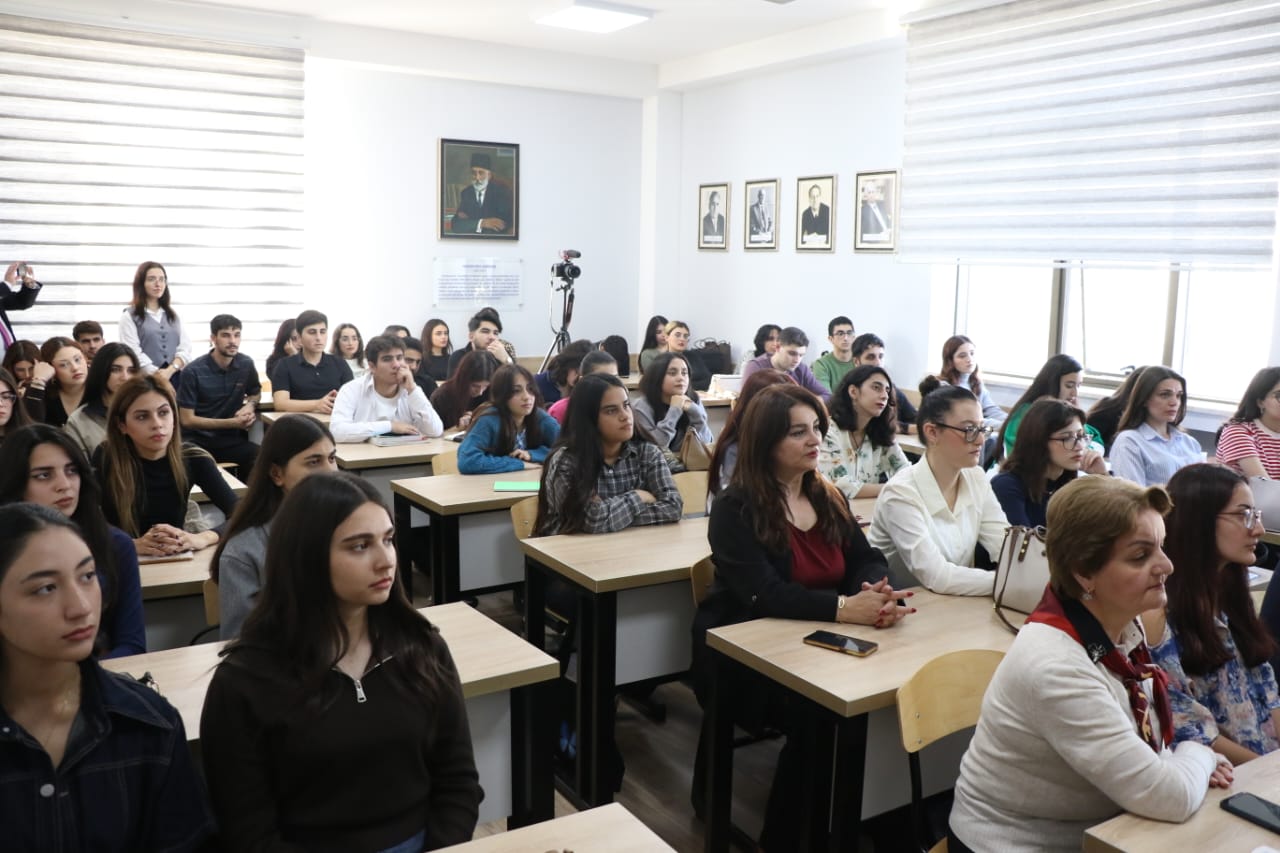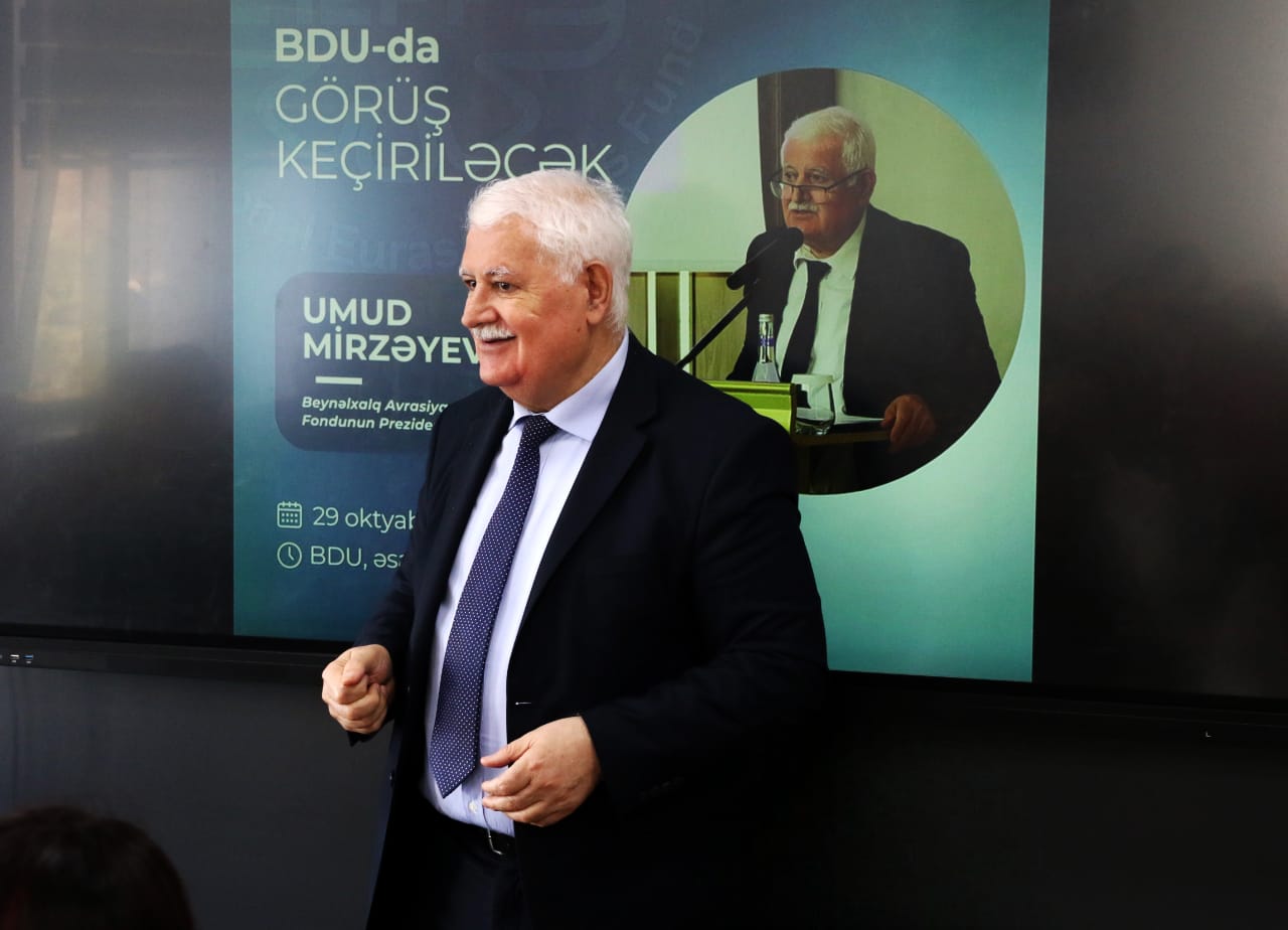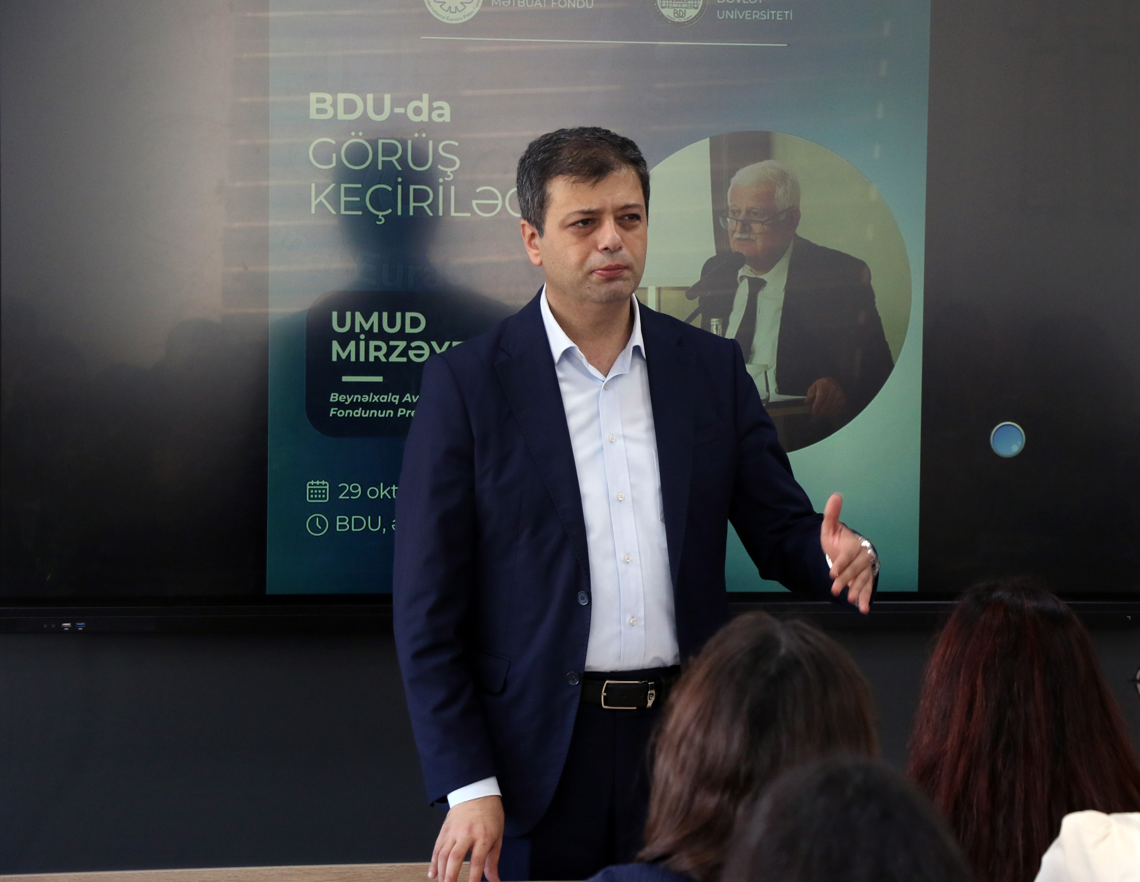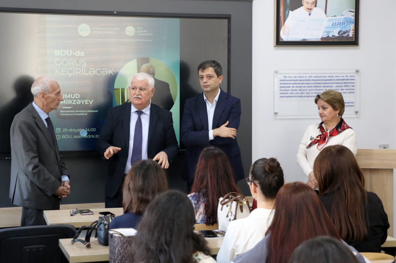 On October 29, a meeting was held at Baku State University between the President of the International Eurasia Press Fund (IEPF), public figure, and Honored Cultural Worker Umud Mirzayev, and the faculty and students of the Faculty of Journalism.